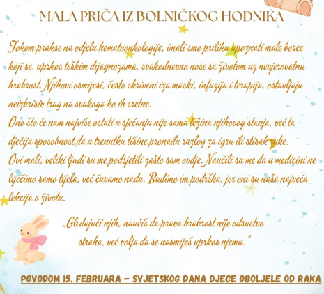 Učenici JU Srednja medicinske škola Sarajevo, kroz svoje obrazovanje, razvijaju ne samo stručna znanja i vještine, već i empatiju, humanost i osjećaj odgovornosti prema pacijentima, posebno prema najranjivijim – djeci. Budući zdravstveni radnici uče koliko su razumijevanje, toplina i podrška važni u liječenju, te koliko jedna lijepa riječ, osmijeh ili pažnja mogu značiti djetetu koje prolazi kroz težak period. Obilježavanjem ovog dana želimo poslati jasnu poruku podrške, nade i zajedništva, te podsjetiti da svako dijete zaslužuje šansu za zdravo, sigurno i bezbrižno djetinjstvo.