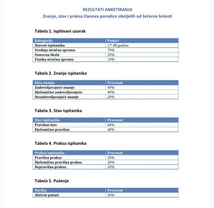 analiza, a rezultati su iskazani tabelarno. Također pripremljen je informativni oglas o dijabetesu koji
